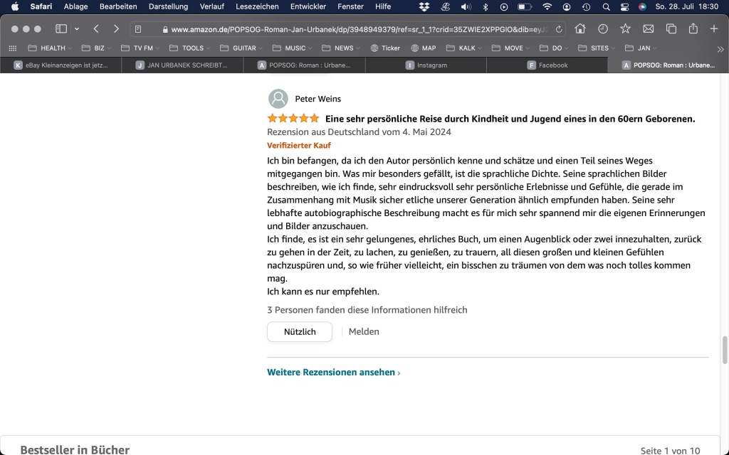 „Der Kölner Autor, Musiker und Kulturwissenschaftler Jan Urbanek hat einen Coming-Of-Age-Roman mit vermutlich autobiografischen Elementen verfasst. Der Protagonist mit dem Namen Jan Jerzy Lotar wächst in den Sechzigern einer Kleinstadt aut und erlebt den langen Schatten des Zweiten Weltkriegs, der bei den Älteren immer noch das (!) Thema ist. Dann die Begegnung mit der Musik! Das stellt für ihn ein Initiationsritual dar und verändert seine kleinbürgerliche Welt, führt ihn in die Plattenläden und zu Konzerten mit Besetzungslisten, die nicht hätten aufregender sein können. Er beginnt selbst als Gitarrist zu spielen und eröffnet sich so neue emotionale Freiräume. Allerdings macht er auch die Bekanntschaft mit Drogen, stürzt ab und rappelt sich wieder auf. Die Beschreibungen der Exzesse haben eine hohe Authentizität, wirken erschütternd und realistisch, ohne zu moralisieren. .„Popsog“ ist ein Buch, mit dem sich viele, in den Sechzigern geborene Leser, oft identifizieren können. Röhrenradios, Radiosendungen, denen man wie gebannt folgte, und das Gefühl des ständig Sensationellen der Musik, aber auch der Verlust des Reizes im Laufe der Jahre sind exemplarische Schnittmengen. Was den Roman von anderen abhebt, ist die geschickte Gliederung in kurze Kapitel mit hautg sehr kurzen Absatzen. Da durch entsteht der Effekt eines kaleidoskopartigen Bildes, das erst nach und nach beim Leser ankommt, aber dafür umso länger nachhallt. Urbanek bewegt sich mit dynamischen Schattierungen zwischen Dur und Moll (mit oder ohne Septime) und lässt auch mal einen Trito- nus erklingen oder einen E7#9, letzteren aber wuchtig. Bewegend.“